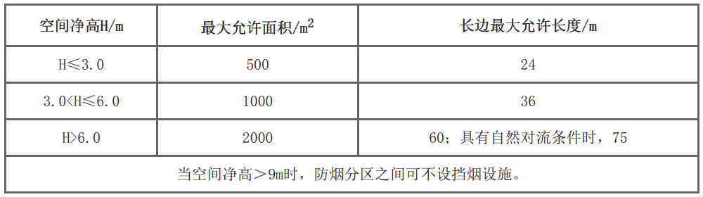 (4)公共建筑、工业建筑防烟分区的最大允许面积及其长边最大允许长度应符合下表的规定,当工业建筑采用自然排烟系统时,其防烟分区的长边长度尚不应大于建筑内空间净高的8倍。