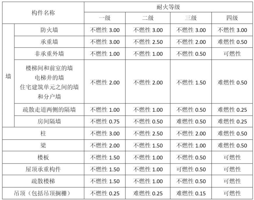 | 三级 | 工业:吊顶、房间隔墙、非承重外墙、屋顶承重构件为难燃; 民用:吊顶、房间隔墙为难燃,屋顶承重构件为可燃 其余都是不燃。 |