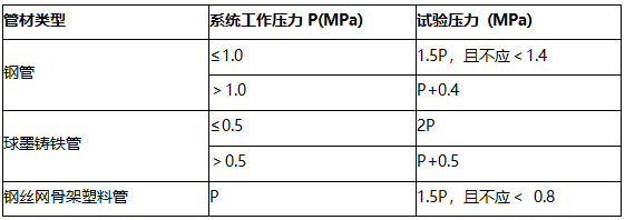 (8)水压强度试验的测试点应设在系统管网的最低点。对管网注水时,应将管网内的空气排净,并缓慢升压,达到试验压力后,稳压30min后,管网无泄漏、无变形,且压力降不大于0.05MPa。