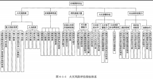 该市区域火灾风险评估指标体系分为火灾危险源评估系统、区域基础信息评估系统、消防救援力量评估系统、火灾预警防控评估系统和社会面防控能力评估系统五部分,如图4-1-1所示。