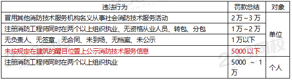 (1)消防设施维护保养检测、消防安全评估等消防技术服务机构,不具备从业条件从事消防技术服务活动或者出具虚假文件的,由消防救援机构责令改正,处5万元以上10万元以下罚款,并对直接负责的主管人员和其他直接责任人员处1万元以上5万元以下罚款;不按照国家标准、行业标准开展消防技术服务活动的,责令改正,处5万元以下罚款,并对直接负责的主管人员和其他直接责任人员处1万元以下罚款;有违法所得的,并处没收违法所得;给他人造成损失的,依法承担赔偿责任;情节严重的,依法责令停止执业或者吊销相应资格;造成重大损失的,由相关部门吊销营业执照,并对有关责任人员采取终身市场禁入措施。