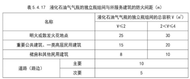 3.液化石油气气瓶的总容积大于1m³、不大于4m³的独立瓶组间,与所服务建筑的防火间距应符合本规范表5.4.17的规定;