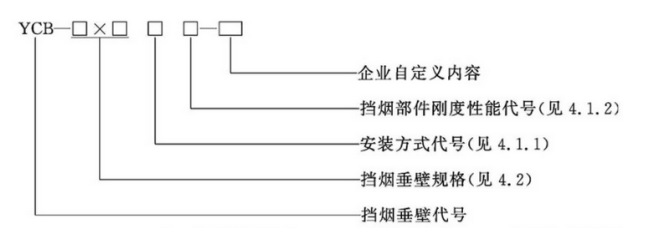 示例1:YCB-2000×600DG-fb1,表示单节宽度为2000mm,挡烟高度为600mm的固定式刚性挡烟垂壁,企业自定义型号内容为fb1(挡烟垂壁的主体材料为防火玻璃)。