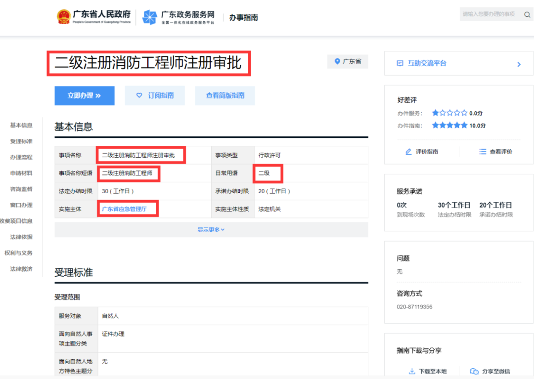 广东省人民政府发布《二级注册消防工程师注册审批》,对基本信息、受理标准、办理流程、申请材料、咨询监督、窗口办理、收费项目信息、法律依据、权利和义务、法律救济进行详细说明!