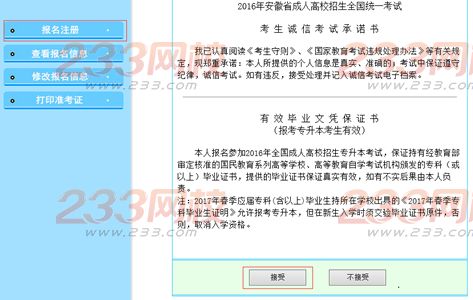 进行2016年安徽成人高考报名注册,点击第一个按钮进行报名注册即可。