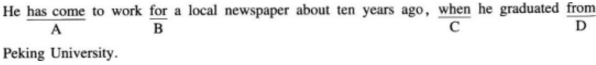【解析】本题考查时间状语从句的搭配。此句描述的是十年前发生的事情,且主句和从句的动作都已完成,用一般过去时即可。因为进入报社工作的动作已经发生,不需要使用现在完成时,因此选择A,改为came。