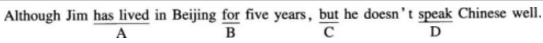 解析:【译文】虽然吉姆在北京已经住了5年了,但是他的中文说得仍然不是很好。