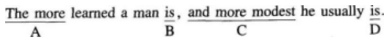 【解析】本题考查固定句型。句型the mote…the more…为固定用法,定冠词the不可省略。此句中and多余,可以删除。因此选C,改为the more modest。