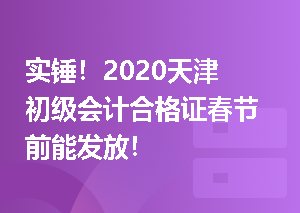 实锤!2020天津初级会计合格证春节前能发放!>>15-20初级会计历年真题初级会计冲刺资料包>>近期,天津市财政局对于2020天津初级会计合格证发放时间做出了回答:以上,我们可以得知,2020天津初级会计证书春节前便可以发放,考生只需静待出合格证领取公告就好啦。