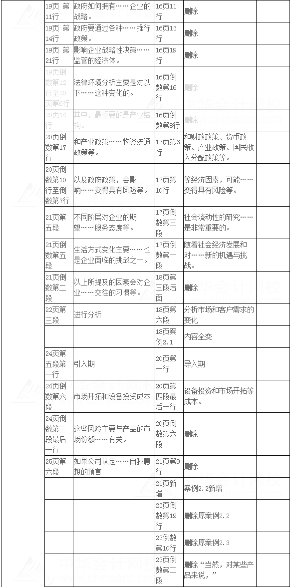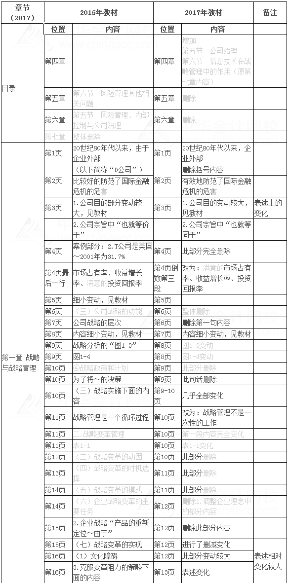 2017年注册会计师考试报名4月5日起,2017年注册会计师考试大纲已经公布,注会考试教材也已上市,为了帮助各位学员更有针对性地进行2017年注会备考,尽快熟悉及了解新教材内容调整变动情况,以下是2017年注册会计师考试《公司战略与风险管理》新旧教材总体变化情况。