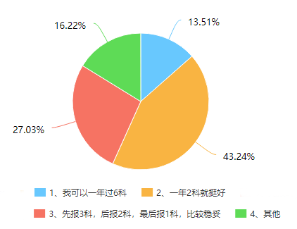大部分学员都选择了1年考2科,27%的学员选择报3保2,还有部分学员选择了3+3(2年6科)的模式。