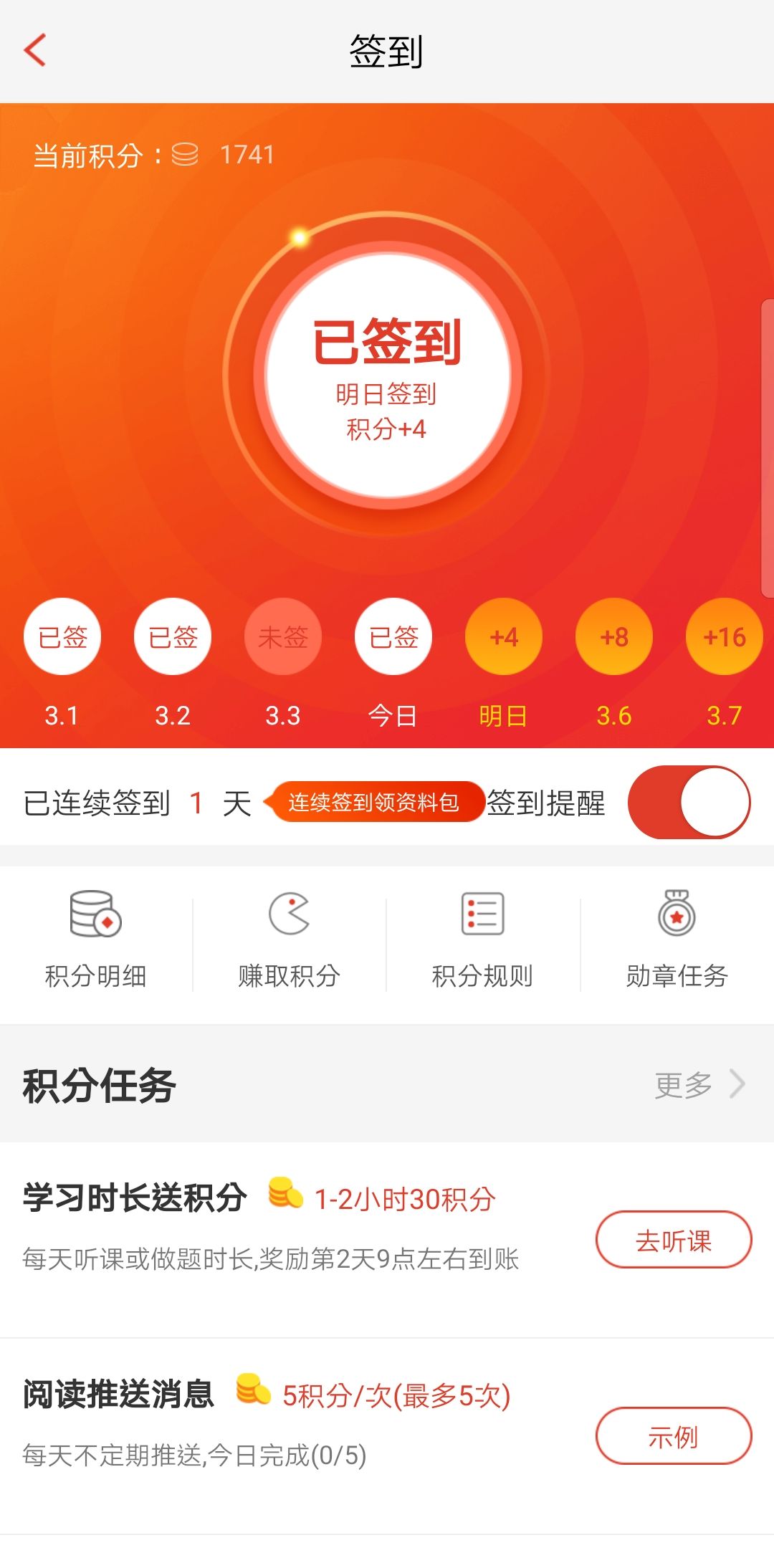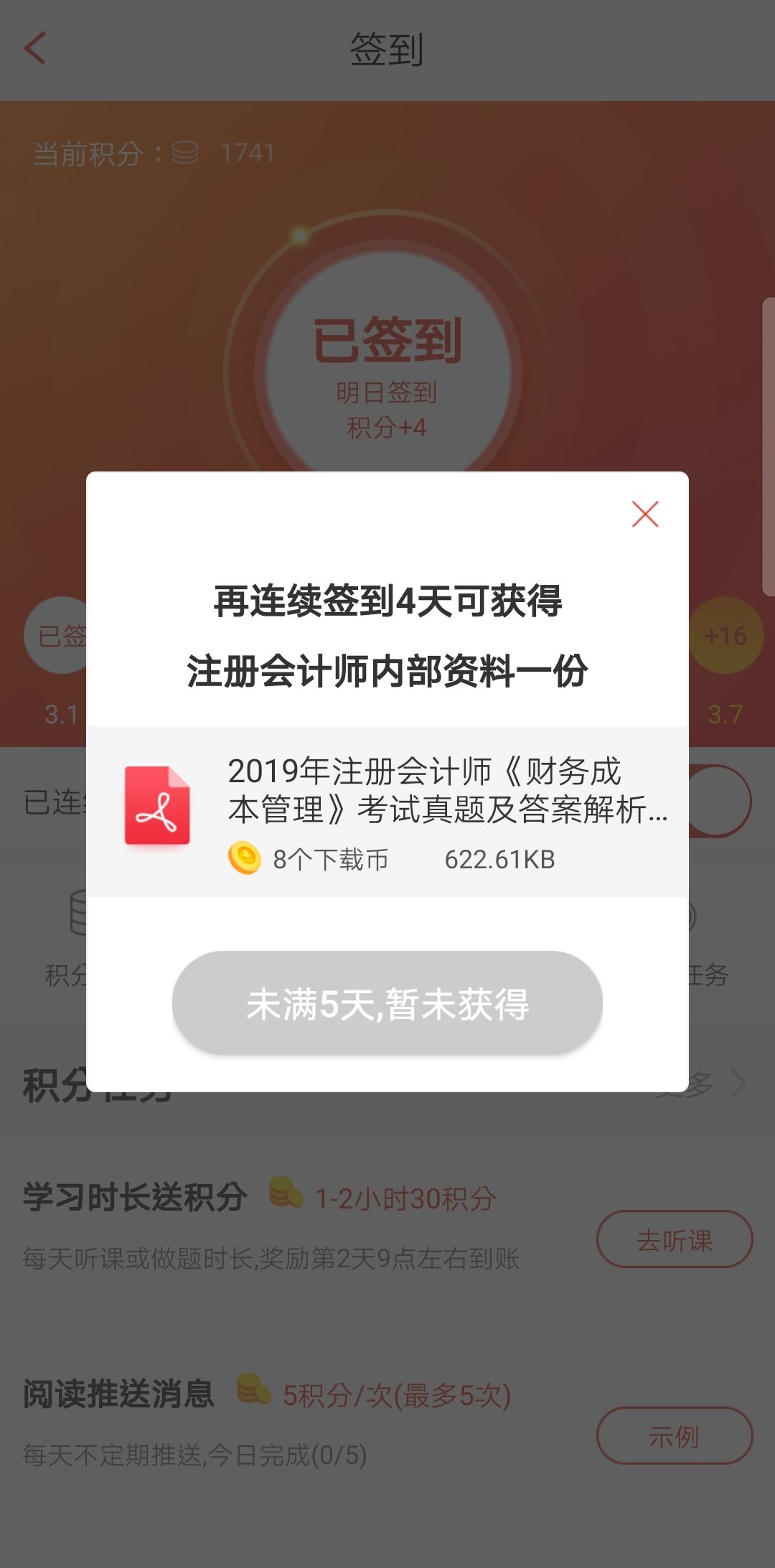 第三步:查看已连续签到天数提醒——已陆续签到5天/7天/10天即可获得“签到资料包”——点击下载即可。