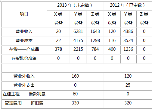 (4)甲公司生产的Y类设备质量稳定,价格适中,受到市场的欢迎;生产的Z类设备属于高端设备,生产成本较Y类设备高20%,因市场上同类设备较少,竞争压力小,售价却比Y类设备高出50%。2013年较2012年市场形势没有大的变化。