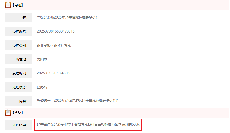 在辽宁省人力资源和社会保障厅的“政策问答”-“咨询公开”栏目,有人提问:高级经济师2025年辽宁省线标准是多少分?
