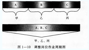 改进设计之后:A、B、C三个岗位合并成为一个岗位,由甲、乙、丙三名员工组成作业组一起共同完成三道工序的加工任务(如图1一10所示)。