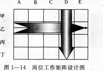 (5)岗位工作矩阵设计。将原来若干岗位的工作进行交叉设计,使某个岗位员工既负责一个工段所有岗位的工作,又承担着某一产品或工序的连续生产加工任务,如图1一l4所示。