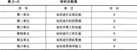 本课程教学载体主要有文字教材、录像教材两种主导形式和电子课件这种辅助形式。文字教材采用合一型;录像教材与文字教材配套,主要讲授教学重点、难点、疑点。电子课件的使用参见《自我发展与团队管理课程多种媒体一体化设计方案》(略)中相关内容。课时分配见表3—5。