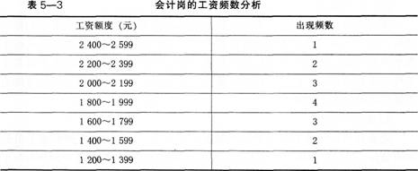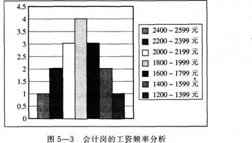 如果被调查单位没有给出某类岗位完整的工资数据,只能采集到某类岗位的平均工资数据。在进行工资调查数据分析时,可以采取频率分析法,记录在各工资额度内各类企业岗位平均工资水平出现的频率,从而了解某类岗位人员工资的一般水平。为了更直观地进行观察,还可以根据调查数据绘制出直方(如图5—3所示)。从表5—3和图5—3很容易看出,该类岗位人员的工资主要浮动范围介于1 600元和2 200元之间,这也就是大部分企业为该类岗位人员支付的工资范围。表5—3分析的是会计岗的工资频数分布情况。