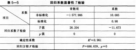 回归方程:W=10.085·E一1 577.986式中,W为月工资额;E为岗位评价得分。回归系数显著性T检验结果见表5—5。