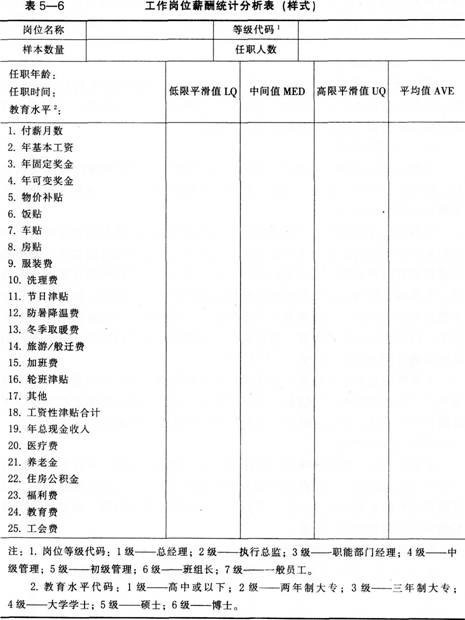 图表分析法是在对调查数据进行统计汇总以及对资料进行整理的基础上,首先按照一定格式编制统计表.然后制成各种统计图如直线图、柱状图、饼状图、结构图等,对薪酬调查结果进行对比分析的一种方法,由于图表分析法具有直观、形象、鲜明、突出和简洁等方面的特点,为很多公司所推崇。在一些国家还曾出版过“图说经济学”“图表统计学”“图说管理学”等类的专门著作。表5—6是国外企业采用的薪酬调查统计分析表(样式)可供读者参考。