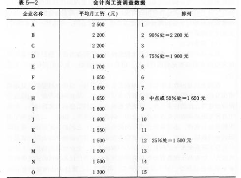 薪酬调查数据的统计分析方法常采用数据排列法。先将调查的同一类数据由高至低排列,再计算出数据排列中的中间数据,即25%点处、中点即50%点处和75%点处。工资水平高的企业应注意75%点处,甚至是90%点处的工资水平,工资水平低的企业应注意25%点处的工资水平,一般的企业应注意中点工资水平,表5—2是调查的会计岗的数据。