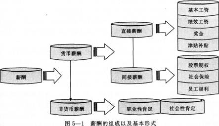 薪酬可分为货币薪酬(或称经济薪酬、外在薪酬)和非货币薪酬(或称非经济薪酬、内在薪酬)。货币薪酬又可分为直接薪酬和间接薪酬,其中,直接薪酬包括基本工资、绩效工资、奖金、津贴等,它们一般以现金形式支付:而间接薪酬则包括社会保险、员工福利、股票期权等,它们一般以非现金形式延期支付。而非货币薪酬则指由工作本身、工作环境和组织特征带的怡悦和满足感等。主要是一种心理效用。非货币薪酬主要可分成两种:一种是与职业发展有关,主要是个人能力的提高和事业的发展,包括晋升机会、职业保障、自我发展、弹性工时、决策参与、工作挑战性、自我成就感等,我们称之为职业性肯定;另一种与工作环境有关,主要指和谐、优越的工作环境和人际环境带来的身心愉悦,包括组织声誉、领导魅力、友善的同事、优越的办公条件、交友的机会、喜欢的任务等,可以称之为社会性肯定
