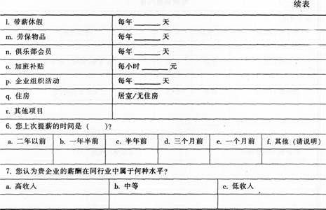 此外,如果被调查的岗位属于经营管理高层岗位的人员,像乘坐头等舱旅行、使用公司的专车、公司提供的家庭保安服务、公司支付的俱乐部会员费以及公司提供的家庭理财咨询等诸多方面的福利,尽管这些花费可能在高管人员总收入中所占比重不会太大,但是这些特殊的福利项目也是在薪酬调查中不容忽视的重要组成部分。
