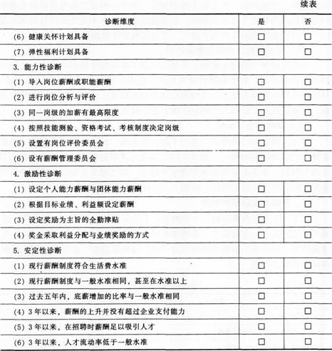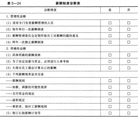 表5—24是较为常见的一个诊断表。它从管理性、明确性、能力性、激励性和安定性五个方面提出了薪酬体系自我诊断建议,以“是”或“否”为备选答案。如果某个诊断维度选项为“否”的数量较多,说明在此方面薪酬制度存在较多问题。