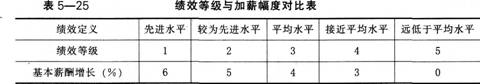 为了将员工薪酬水平的提高与他们对企业的贡献率有效地结合在一起,也可以根据员工绩效水平,确定其薪酬调整的幅度。例如,国内外的一些企业采取业绩薪酬加薪的办法,见表5—25。