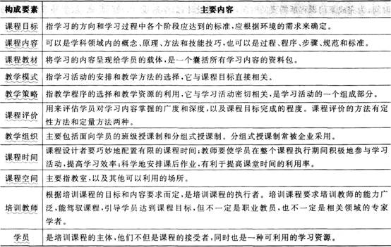 (2)课程设置。课程设置就是根据教学计划的要求,确定教学内容,建立合理的培训课程体系的活动过程。