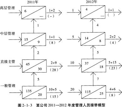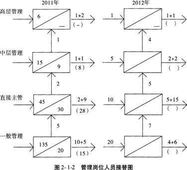 【例题2.1.22】某公司2011-2012年度管理人员变动情况如图2-1-2所示,2012年度各级管理人员的补充是通过外部招聘的方式来完成的,公司高层在总结本年度人力资源管理工作经验的基础上,作出了以下决策:首先,2013年度除一般管理人员可以通过外部各种招聘渠道补充之外,其他各层次管理人员一律由公司内部选拔;其次,各个层次的管理人员补充需要量严格按照公司制定的定员标准执行,不得突破额定人数;最后,要妥善安排好提升受阻的后备人才。2013年管理岗位人员接替统计表如表2-1-1所示。