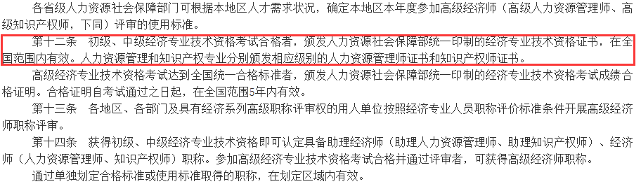 早在2020年1月8日,人社部便发布了《经济专业技术资格规定》和《经济专业技术资格考试实施办法》,其中,《经济专业技术资格规定》第十二条明确说明:“初级、中级经济专业技术资格考试合格者,颁发人力资源社会保障部统一印制的经济专业技术资格证书,在全国范围内有效。人力资源管理和知识产权专业分别颁发相应级别的人力资源管理师证书和知识产权师证书。”