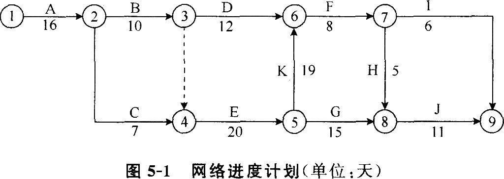 1.按图5-1所示的网络进度计划,按顺序完成B-E-K-I工作,施工机械在现场的闲置时间为多少天?
