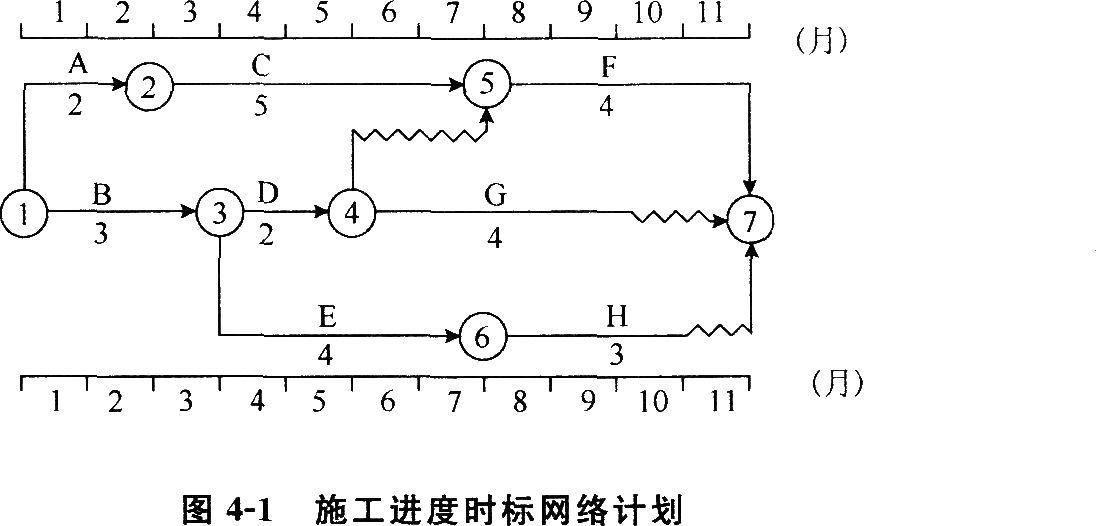 施工单位编制的施工进度时标网络计划,如图4-1所示。该项目的各项工作均按最早开始时间安排,且各项工作均按匀速施工。2011年1至5月工程造价指数见表4-2。