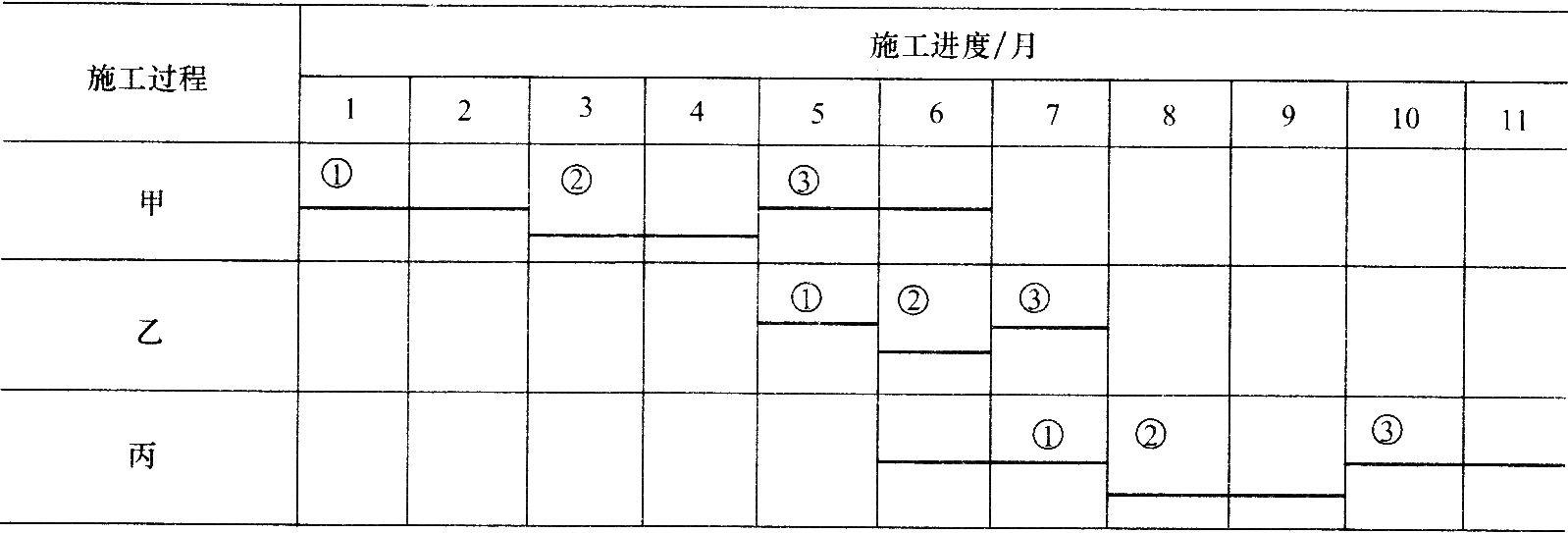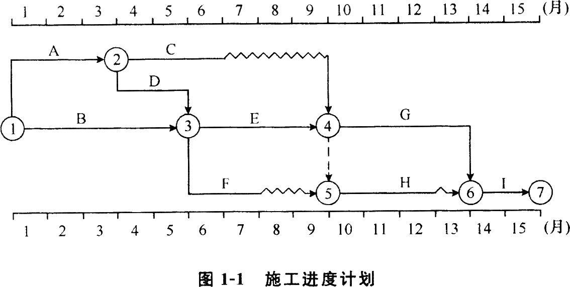 3、某实施监理的工程,合同工期15个月,总监理工程师批准的施工进度计划如图1-1所示。