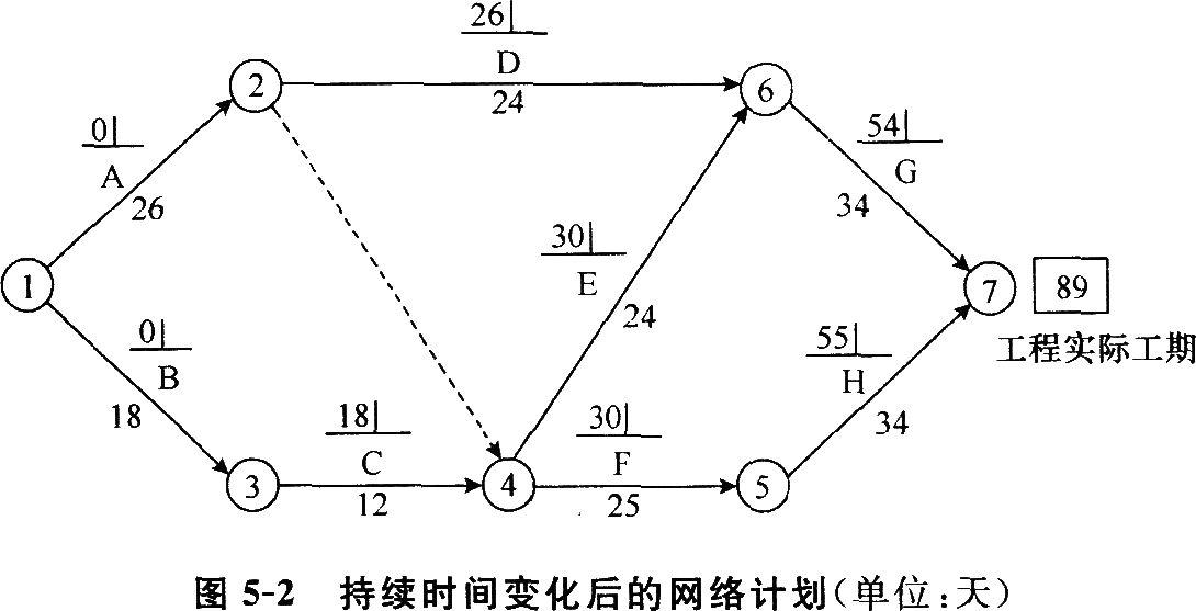 在施工过程中,由于业主直接原因、不可抗力因素和施工单位原因,对各项工作持续时间产生一定的影响,其结果见表5-1(正数为延长工作天数,负数为缩短工作天数),网络计划的计划工期为84天。由于工作持续时间的变化,网络计划的实际工期为89天,如图5-2所示。