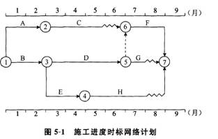 5、某工程项目施工合同于2012年12月签订,约定的合同工期为20个月,2013年1月开始正式施工。施工单位按合同工期要求编制了混凝土结构工程施工进度时标网络计划(如图5-1所示),并经专业监理工程师审核批准。