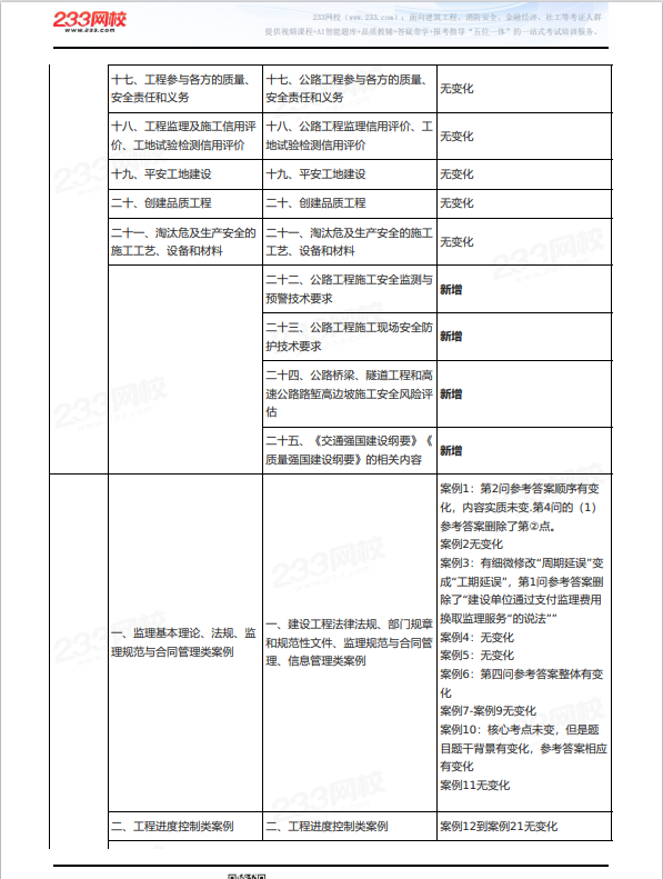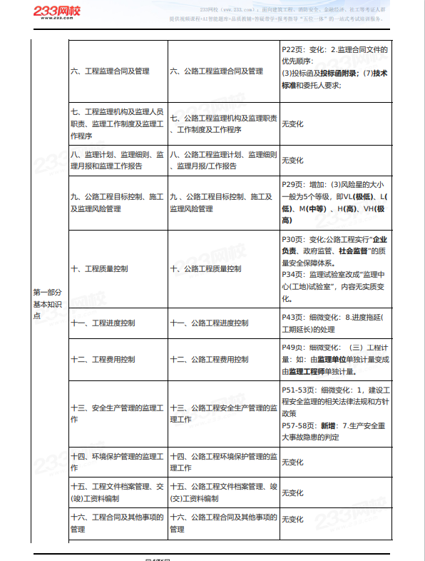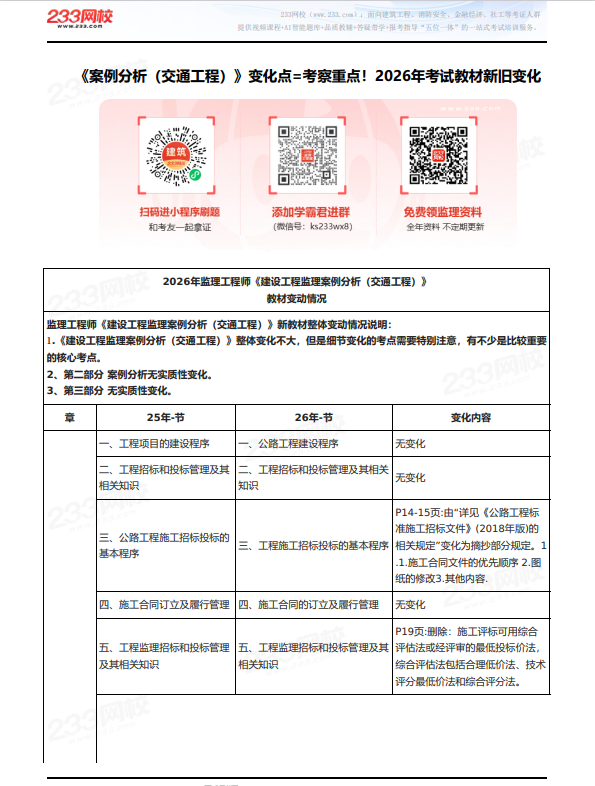 2026年监理工程师《建设工程监理案例分析(公路工程)》考试教材已于1月15日出版发行,跟旧教材相比,新版教材变化大不大呢?有哪些变化?233网校已第一时间整理新旧教材变化对比表,供大家参考学习!