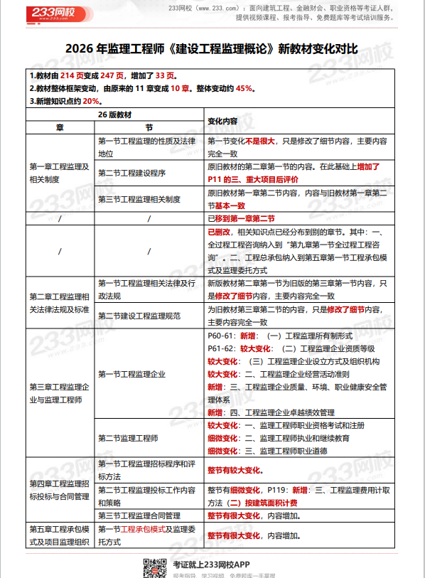 2026年监理工程师《建设工程监理概论》考试教材已于1月26日出版发行,跟旧教材相比,新版教材变化大不大呢?有哪些变化?233网校已第一时间整理新旧教材变化对比表,供大家参考学习!