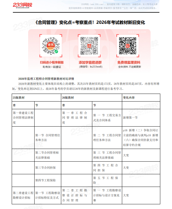 2026年监理工程师《建设工程合同管理》考试教材已于1月26日出版发行,跟旧教材相比,新版教材变化大不大呢?有哪些变化?233网校已第一时间整理新旧教材变化对比表,供大家参考学习!