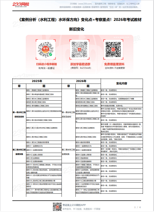 2026年监理工程师《建设工程监理案例分析(水利)》考试教材已于3月12日出版发行,跟旧教材相比,新版教材变化大不大呢?有哪些变化?233网校已第一时间整理新旧教材变化对比表,供大家参考学习!