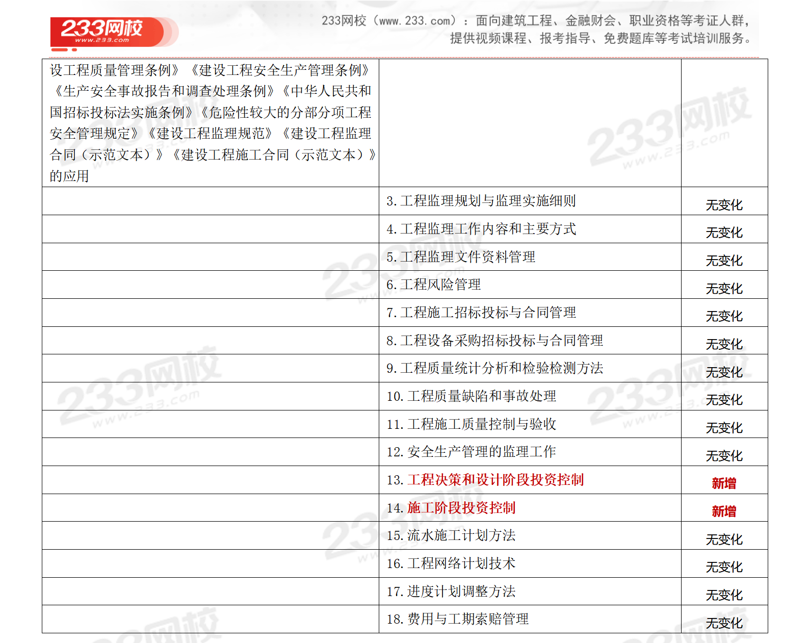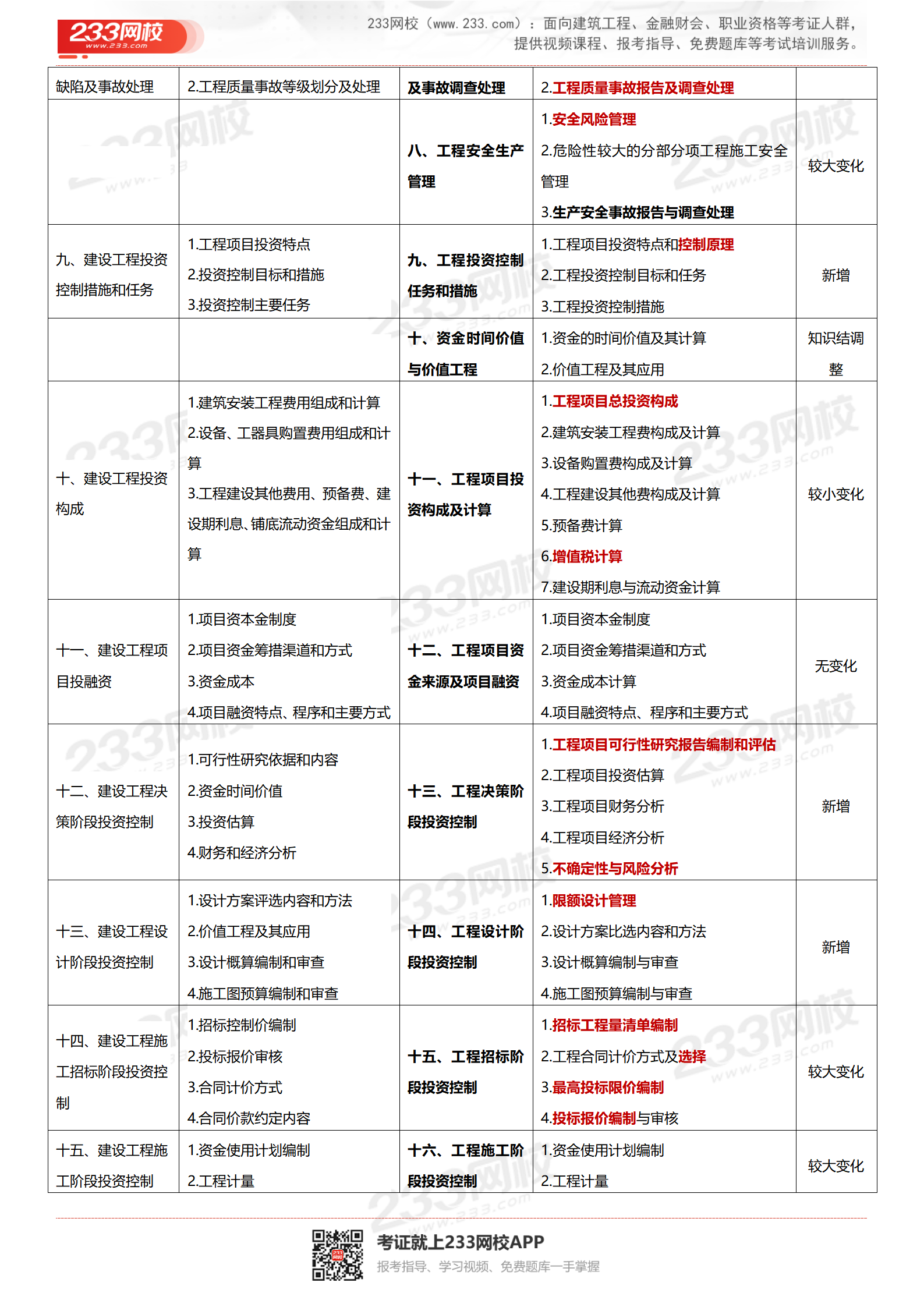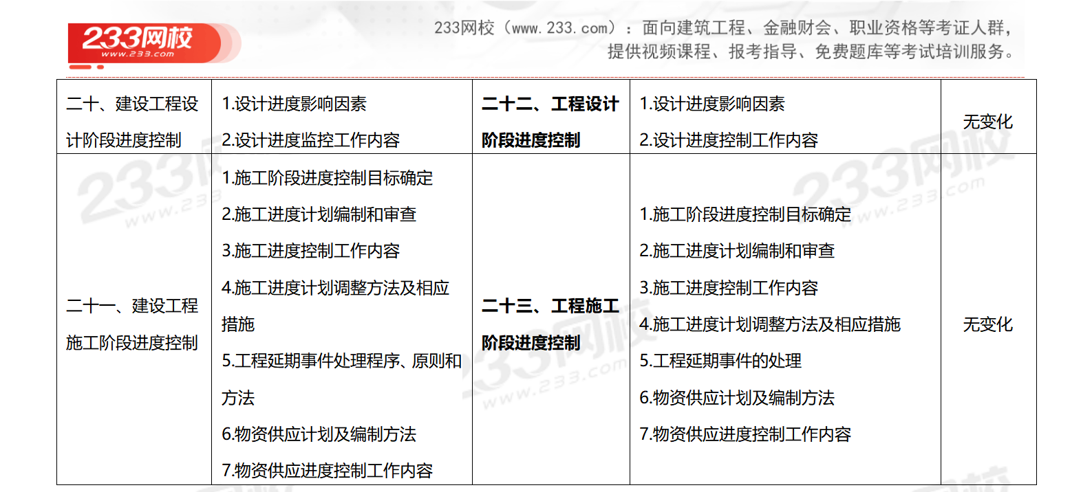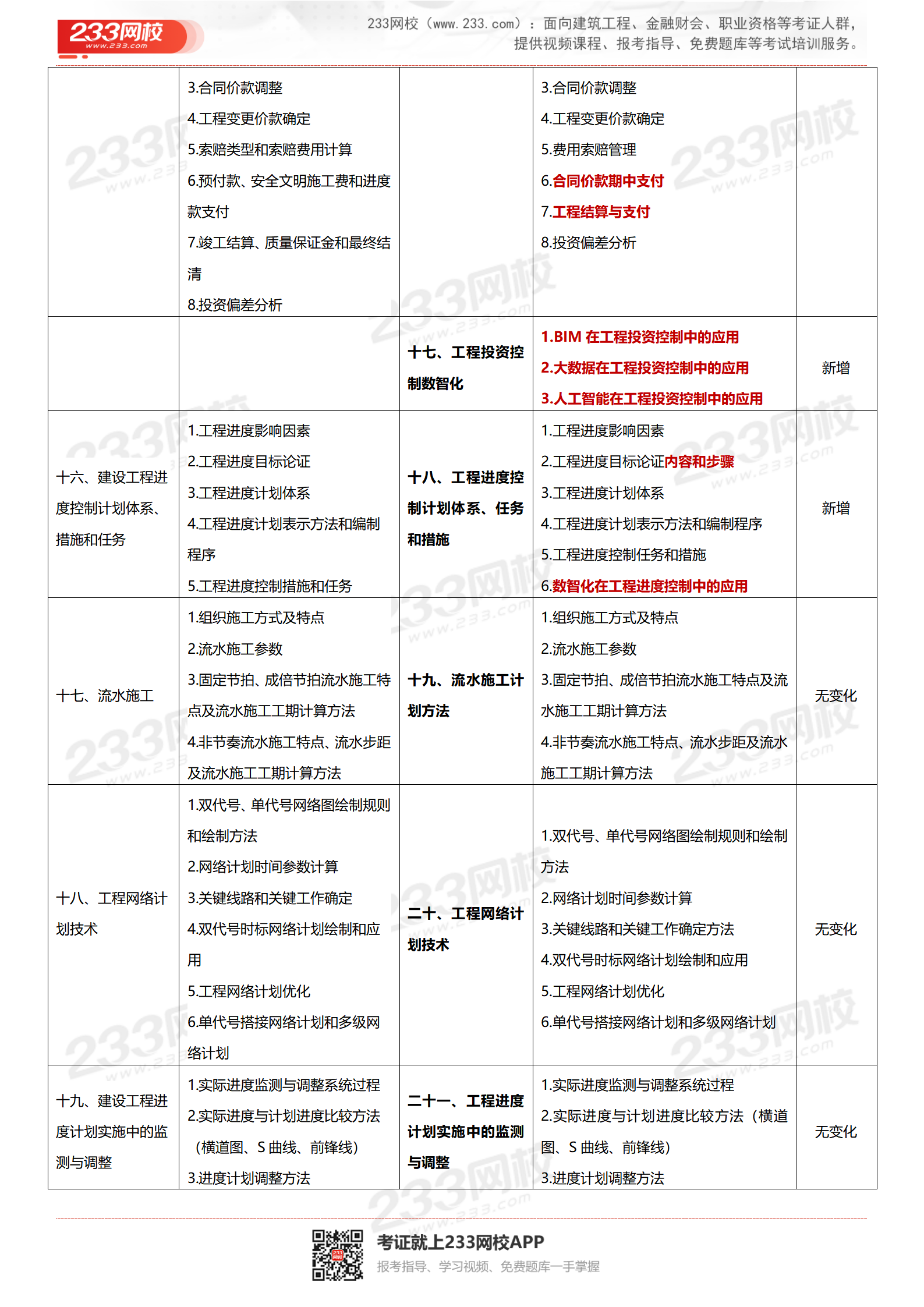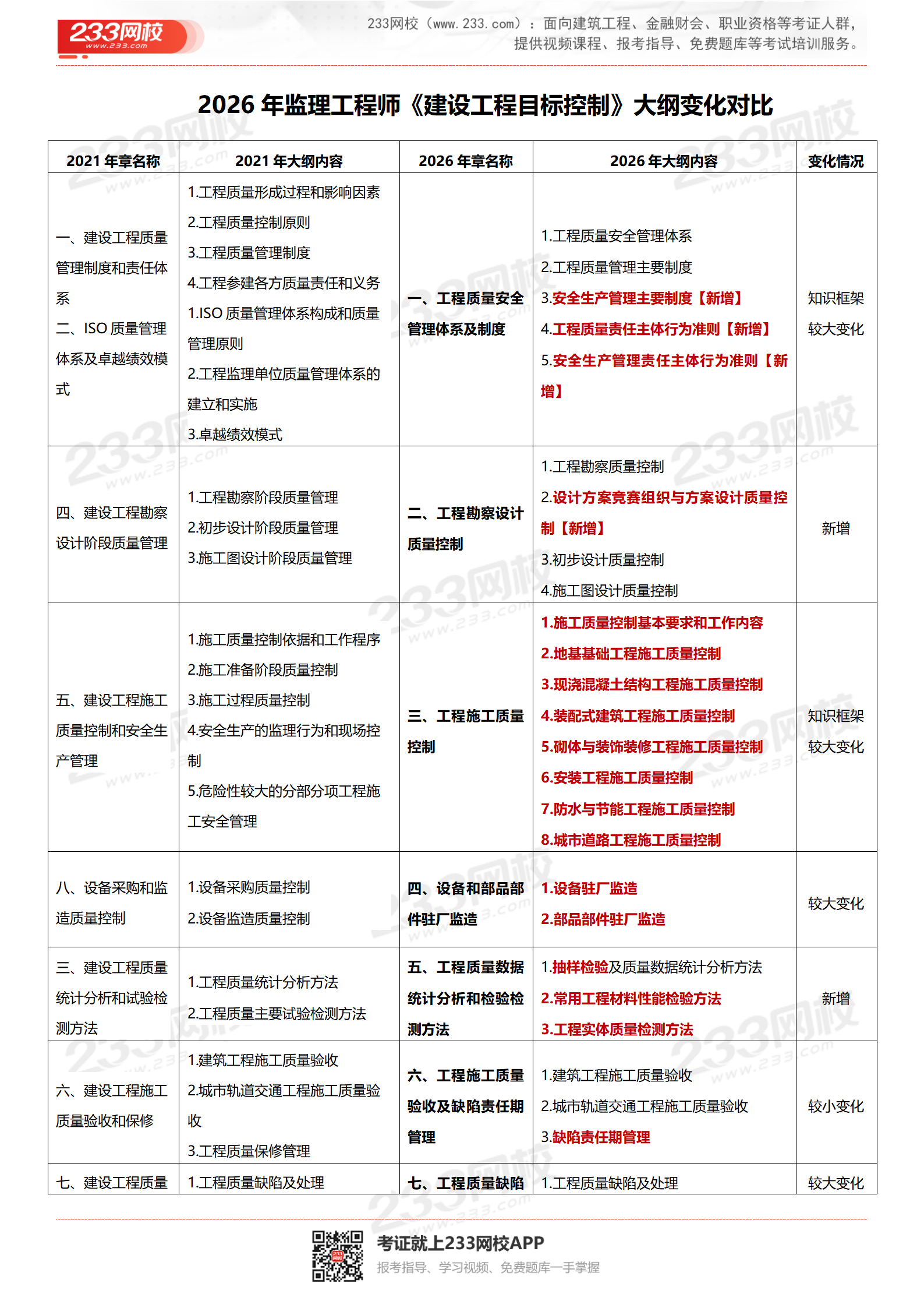 ★【233网校总结】2026年考纲和2021年考纲相比,质量与投资篇整体框架进行调整,对整个章节进行排版,新增部分知识点,大纲整体变动大;进度篇基本无变化,新增1.5节知识点。由原来的21章变成23章。考纲整体变化约50%。