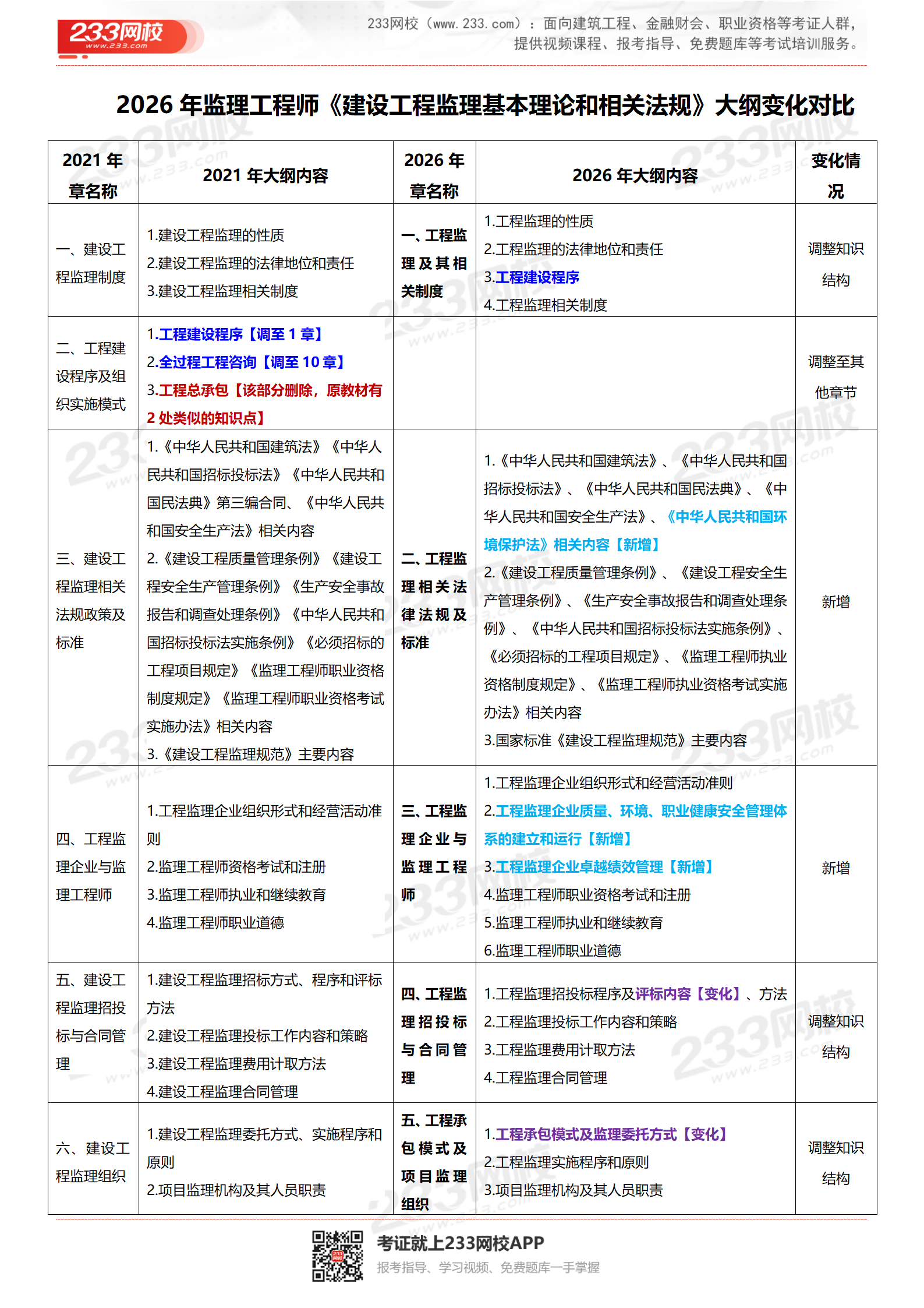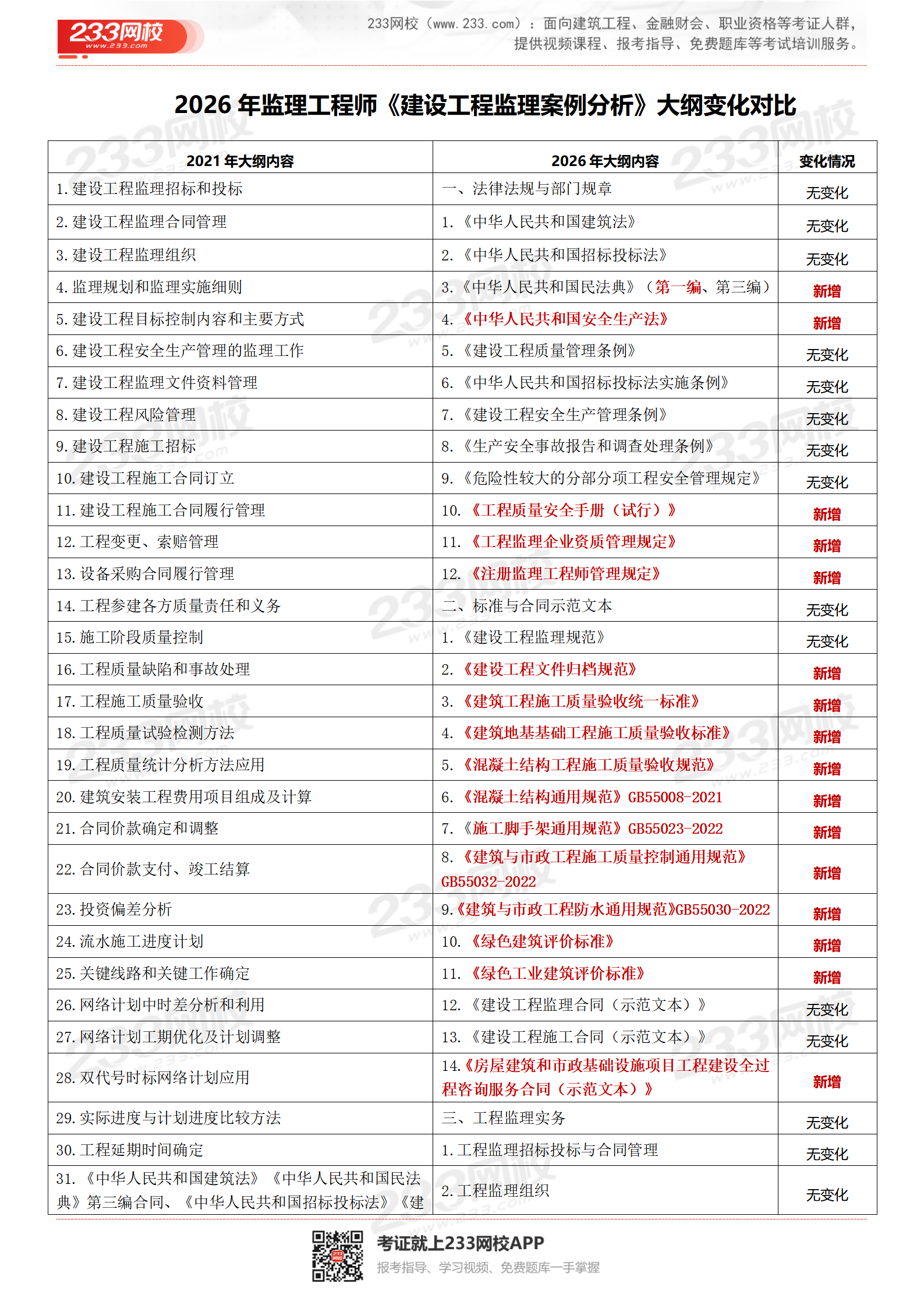 ★【233网校总结】2026年考纲和2021年考纲相比,整体框架进行调整,新增部分知识点,主要是新增规范标准等文件。考纲整体变化约40%。