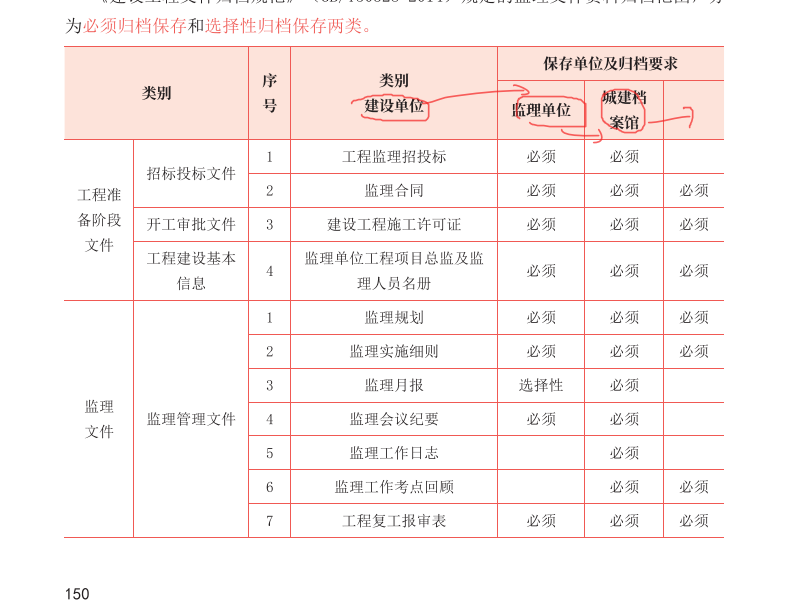 勘误3:P150页,表格,保存单位及归档要求,对应:建设单位、监理单位、城建档案馆