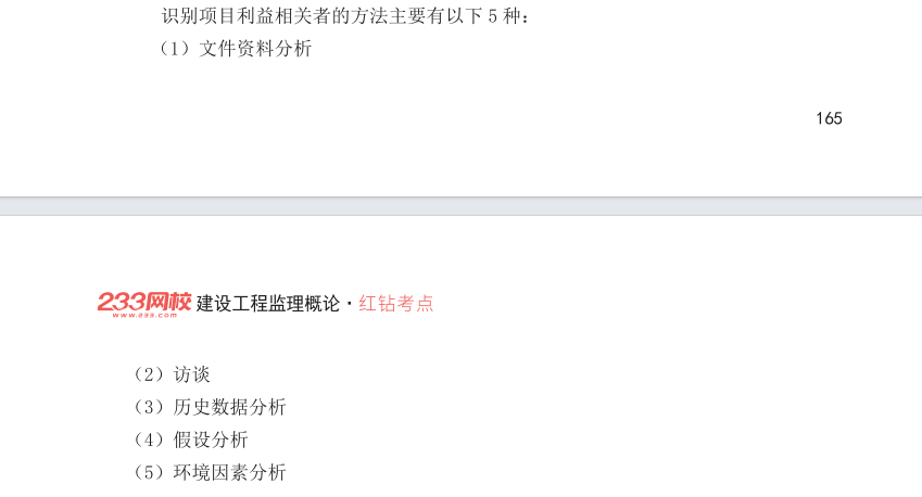 勘误2:P166,识别利益相关方的方法:(1)文件资料分析法(2)头脑风暴法(3)检查清单法(4)访谈法(5)环境因素分析法