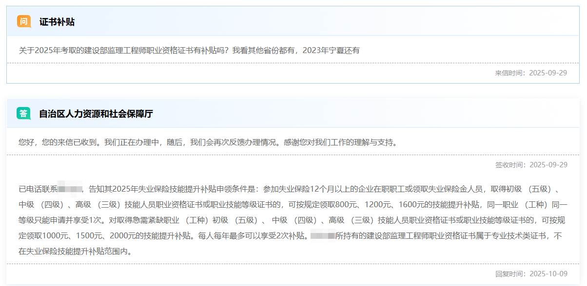 近日有网友咨询:关于2025年考取的建设部监理工程师职业资格证书有补贴吗?