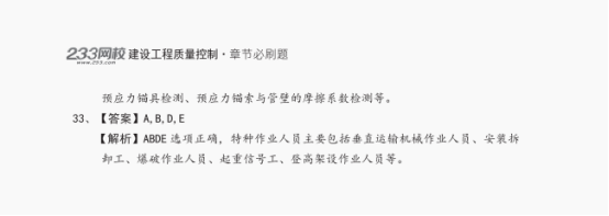 【解析】ABDE选项正确,特种作业人员主要包括垂直运输机械作业人员、安装拆卸工、爆破作业人员、起重信号工、登高架设作业人员等。