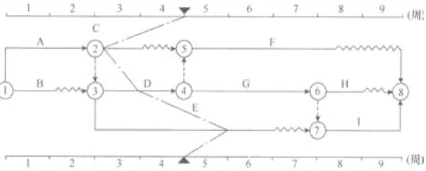 41.某工程双代号时标网络计划执行到第4周未时,检查其实际进行如下图前锋线所示,可以看出()。