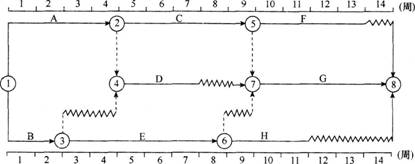 20、 某工程双代号时标网络计划如下图所示。如果B、D、G三项工作共用一台施工机械,而且必须顺序施工,则在不影响总工期的前提下,该施工机械在现场的最小闲置时间是( )周。