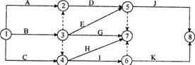 19、 某分部工程双代号网络计划如下图所示,图中错误的是( )。